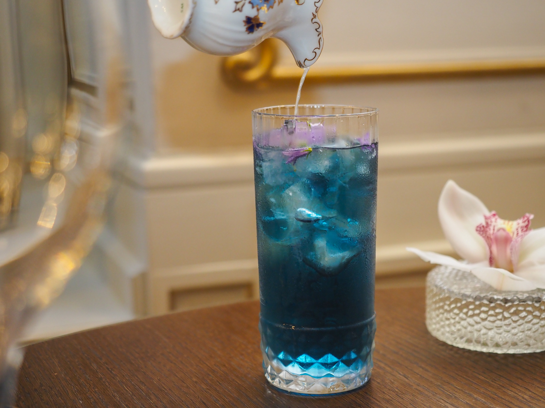 Nam Dok Anchan – Pillangóborsó-virág ital lime-lével (herbál ital, lime hatására színt vált, ceremóniákon is fogyasztják)